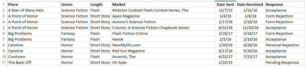I’m currently using Excel with a format similar to your example. I’ve thought about making the jump to Duotrope, having read your praise of the product. However, I also use Excel to track my productivity (ie word count) over the months and years. And there’s always the fear of learning something new.