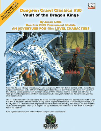 Let’s kick things off with my very first professional job in the tabletop gaming industry way back in 2005: Dungeon Crawl Classics #30: Vault of the Dragon Kings.