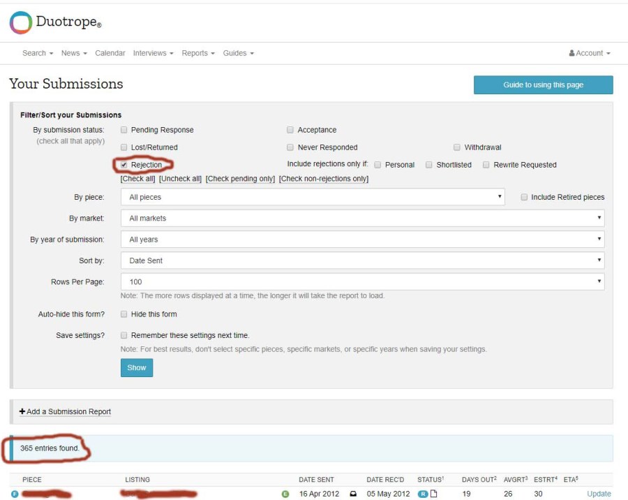 I’ve (crudely) circled the important things in red and removed the story and publisher name from my very first rejection through Duotrope way back in May of 2012. Now here are some interesting data point from those 365 rejections.
