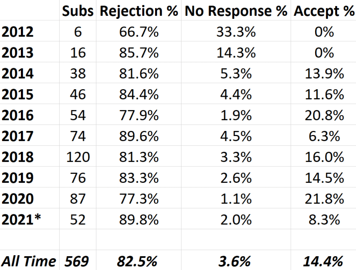 And there you have it, the most accurate look I can give you at my submissions stats in the last ten years. These numbers may differ to some extent from older versions of this post from my admittedly flawed methodology, but not too much. No more than a percentage point here and there. So wish me luck in turning 2021 around, and, please, feel free to share your own past and present acceptance rates in the comments.