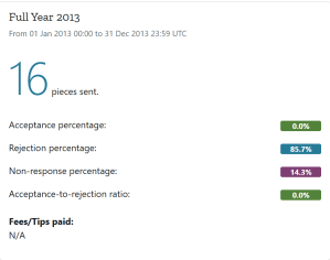 Exciting, huh? Six whole submissions with no acceptances. Obviously, I took my first tentative steps into submitting short fiction in 2012. I was employed in the gaming industry at the time, and I had plenty of writing credits there, but no general fiction pubs to my name yet. All six submissions ended in form rejections. Sadly, the six markets I submitted to in 2012 are now defunct or on indefinite hiatus. (This will be a running theme.)