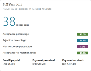 Success! I sold my first story, “Night Games,” to the now-defunct Devilfish Review on May 1st, 2014. To say I was excited is a bit of an understatement. In fact, I scared the shit out of my wife and our cats when I bellowed “FUCK YEAH!” when the acceptance email came through. I went on to sell another four stories in 2014, giving me a total of five for the year and a not-too-shabby acceptance percentage of 13.2%. I also made a cool hundred bucks, which, of course, isn’t much, but getting paid anything for my fiction felt pretty good. This was also the year I figured out that I have knack for flash fiction, and I started writing and submitting A LOT of it toward the end of 2014. In addition, I began to think that folks might be interested in an honest and detailed account of my submission journey. Little did I know I’d soon sign myself up for an entire decade of no’s and not for us’s. 🙂