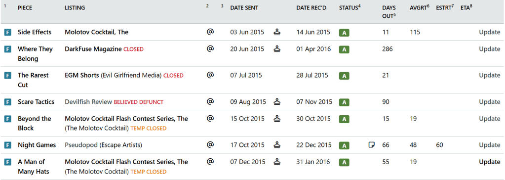 Just one bit of clarification on the acceptances. Duotrope counts an acceptance for the year the submission was sent not the year it was actually accepted, which is how I tend to calculate things. Since I’m pulling screen shots from Duotrope directly, we’ll go with their method for consistency.