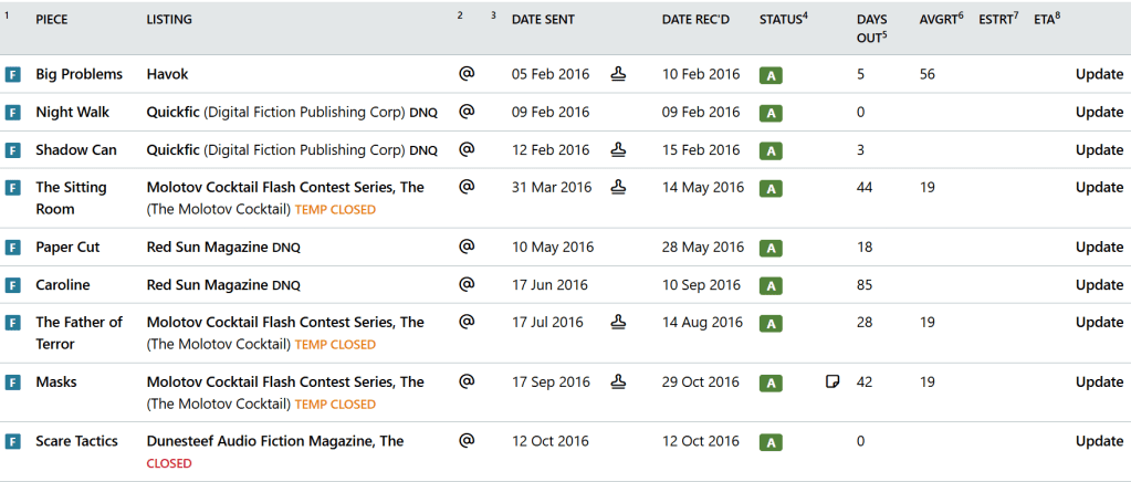 Here are my total stats (pulled once again straight from Duotrope) for 2016.