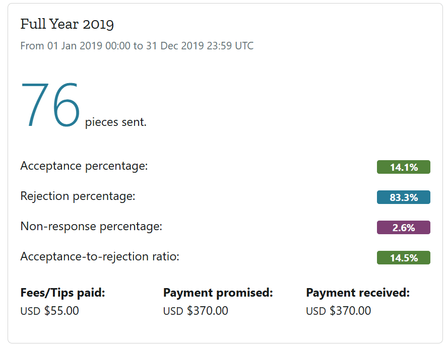 I set a lot of personal submission records in 2018 (year four), and though year five wasn’t nearly as good, I maintained both a solid number of submissions and a respectable number of acceptances. In other words, I was consistent, and that’s not a bad way to be in the grueling and often cruel world of publishing. This is not to say there wasn’t some regression, but it’s the kind I can live with. Anyway, let’s take a look at Rejectomancy year five.