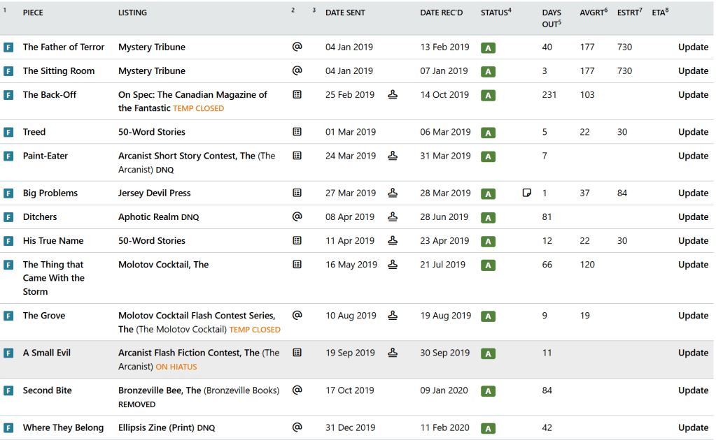 You may notice once anomaly in my acceptance list, and that’s the sale to The Bronzeville Bee, a market that’s marked REMOVED and closed down shorty after I received an acceptance from them. I left it as an acceptance (because it was), though I maybe should change it to lost/returned now. I’d go on to sell that story for reals to MetaStellar, a much better market that actually still exists. 🙂