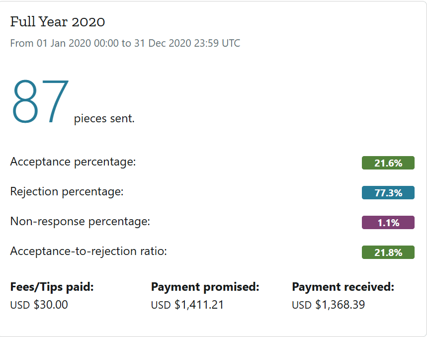 So, as you can see, 2020 was a all kinds of good. I sent a solid number of submissions, and I managed an acceptance percentage over 21%. That’s pretty hard to do, and I was and am damn proud of my hit rate in that year. I also made a decent amount of money on short story sales, and while it’s not the kind of cash that you can make a living on, it ain’t bad for publishing flash and shorts in the SFFH market. If I hadn’t already been an SFWA member, I would have qualified for a full membership off this year alone. So, you know, not too shabby.