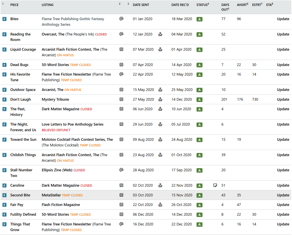 I scored 17 acceptances in 2020, one less than than the 18 I scored in 2018, which remains my personal record. That said, the quality of acceptances in 2020 was much better than 2018. Eleven of my seventeen acceptances were to pro-paying markets, and there’s a first place flash contest win in the mix as well that netted me 300 bucks. Not bad.