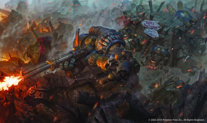 Horgrum shook off Solissa’s hand and raced toward his father, screaming in rage. He made it five paces before another shot rang out. The bullet struck his axe, smashing it from his grip. He dove to the ground. Bodies lay everywhere, human and trollkin. His hand fell across the butt of a rifle as something huge loomed out of the smoke, a human warrior encased in steam-powered armor that made him nearly as large and powerful as a full-blooded troll.