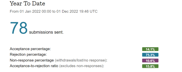 Pretty terrible submission numbers despite the acceptance. November was a rough month in a lot of ways, and I got a little off track with submissions, focusing more on other aspects of my writing. Anyway, I’m sitting at 79 total submissions for the year, and it is highly unlikely I hit 100 for 2022. That’s okay, though. A dozen acceptances has made the year a decent one, and if I can hit 90 subs with another acceptance or two, I’ll call 2022 a marginal victory. Here are more overall yearly statistics via Duotrope.